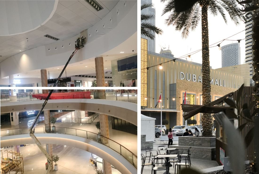 The work areas were spread across significant elevations within the mall, and reaching them safely meant deploying spider lifts and boom lifts. Operating at such heights inside an active retail environment demanded certified, highly trained professionals, and to meet the mall’s compliance requirements, ZARCO® ensured its entire team underwent official certification for both lifting systems before the project even began.